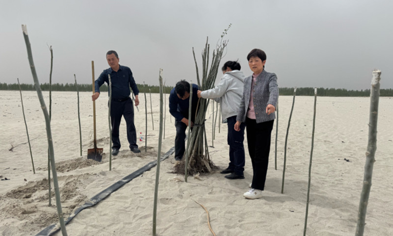 Los hijos de Fu Zhizhou plantan árboles en la aldea de Haermodun, condado Hejing, en la prefectura autónoma mongola de Bayingolin, región autónoma uigur de Xinjiang, el 25 de abril de 2025. Foto: Zhao Yusha/GT