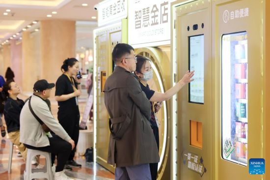 SHANGHAI, 5 mayo, 2025 (Xinhua) -- Un ciudadano aprende acerca una "tienda inteligente de oro" en un centro comercial, en Shanghai, en el este de China, el 5 de mayo de 2025. Recientemente, una "tienda inteligente de oro" hizo su debut en un centro comercial en Shanghai. Con funciones de autoservicio para el reciclaje y la compra de oro, el sistema inteligente de reciclaje de oro ofrece servicios como autopedido, detección automática y pago rápido. El sistema puede detectar automáticamente el peso y la pureza del oro colocado en el dispositivo, calcula la cantidad a reciclar según el precio del oro en tiempo real y procesa los pagos con agilidad, marcando un nuevo hito en el campo del reciclaje de oro. (Xinhua/Wang Xiang)