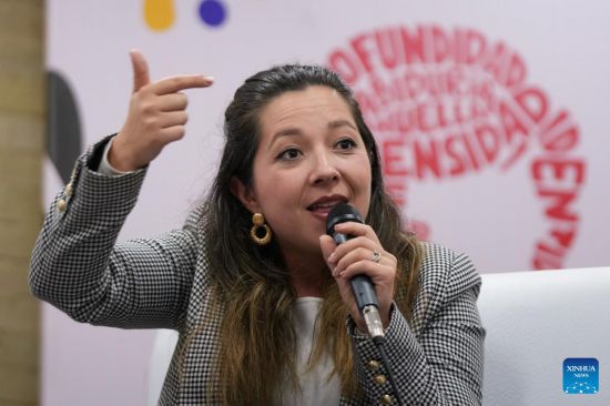 BOGOTA, 8 mayo, 2025 (Xinhua) -- Imagen del 7 de mayo de 2025 de la directora ejecutiva de la Cámara Colombo China de Inversión y Comercio, Ingrid Chaves, hablando durante el lanzamiento del libro "Charlas sobre China" en el marco de la Feria Internacional del Libro de Bogotá (FilBo) 2025, en el recinto ferial Corferias, en la ciudad de Bogotá, capital de Colombia. El libro "Charlas sobre China", un compendio sobre el país asiático a cargo de cuatro expertos en los ámbitos cultural, político y comercial, fue lanzado el miércoles en el marco de la FilBo 2025 que se lleva a cabo en el recinto ferial de la capital colombiana. (Xinhua/Andrés Moreno)