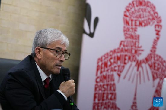 BOGOTA, 8 mayo, 2025 (Xinhua) -- Imagen del 7 de mayo de 2025 del economista e investigador colombiano, Carlos Martínez Becerra, miembro de la Academia Colombiana de Ciencias Económicas, hablando durante el lanzamiento del libro "Charlas sobre China" en el marco de la Feria Internacional del Libro de Bogotá (FilBo) 2025, en el recinto ferial Corferias, en la ciudad de Bogotá, capital de Colombia. El libro "Charlas sobre China", un compendio sobre el país asiático a cargo de cuatro expertos en los ámbitos cultural, político y comercial, fue lanzado el miércoles en el marco de la FilBo 2025 que se lleva a cabo en el recinto ferial de la capital colombiana. (Xinhua/Andrés Moreno)