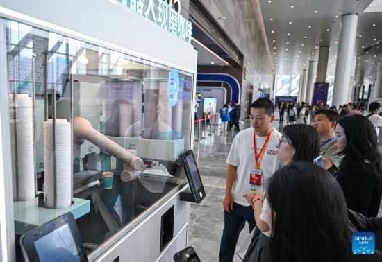 WUHAN, 16 mayo, 2025 (Xinhua) -- Visitantes compran café servido por un robot en la 20 Exposición Internacional de Optoelectrónica del Valle Optico de China (OVC Expo, por sus siglas en inglés), en el Centro de Convenciones y Exposiciones del Valle Optico de China, en Wuhan, en la provincia de Hubei, en el centro de China, el 16 de mayo de 2025. Comenzando el viernes durante tres días con más de 20 conferencias y eventos especiales programados, se espera que la OVC Expo atraiga a cerca de 400 expositores y más de 30.000 visitantes profesionales, entre ellos muchas empresas nacionales y extranjeras conocidas en el campo de la industria optoelectrónica. (Xinhua/Du Zixuan)