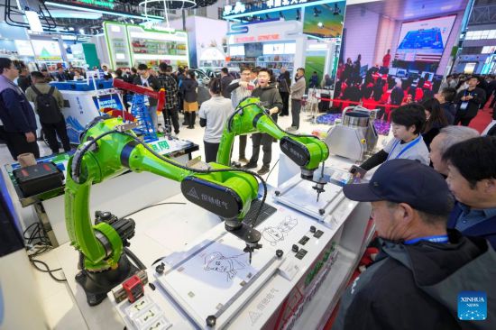 HARBIN, 17 mayo, 2025 (Xinhua) -- Visitantes observan brazos robóticos inteligentes en la 34 Feria Internacional de Economía y Comercio de Harbin, en Harbin, capital de la provincia de Heilongjiang, en el noreste de China, el 17 de mayo de 2025. La feria se inauguró aquí el sábado, atrayendo a expositores de más de 110 países y regiones. (Xinhua/Wang Jianwei)