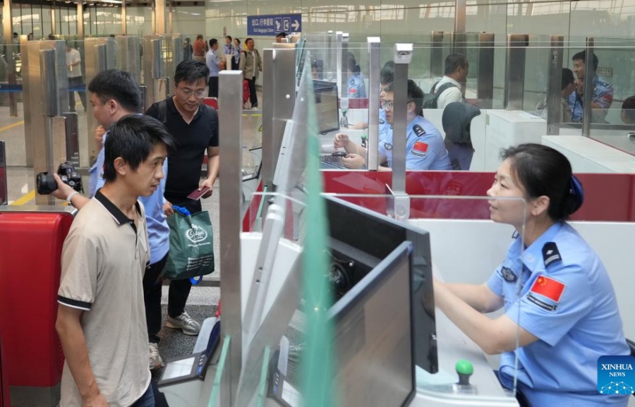 Imagen del 20 de junio de 2025 de un oficial de policía de la Estación General de Inspección Fronteriza de Entrada y Salida de Beijing asistiendo a ciudadanos chinos con sus trámites de entrada en el Aeropuerto Internacional Capital de Beijing, en Beijing, capital de China. El primer vuelo chárter con 330 ciudadanos chinos evacuados de Irán llegó el viernes al Aeropuerto Internacional Capital de Beijing procedente de Asjabad, capital de Turkmenistán. (Xinhua/Zu Guobao)