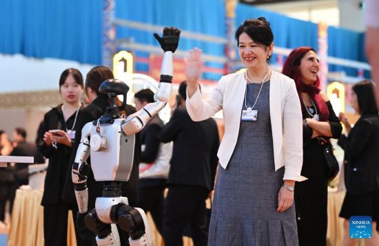 TIANJIN, 26 junio, 2025 (Xinhua) -- Imagen del 25 de junio de 2025 de una invitada interactuando con un robot durante la Velada Cultural de la XVI Reunión Anual de los Nuevos Campeones, también conocida como Davos de Verano, en la municipalidad de Tianjin, en el norte de China. Los asistentes aprendieron sobre la cultura tradicional china, degustaron comida característica de Tianjin y disfrutaron presentaciones en el evento. (Xinhua/Li Ran)