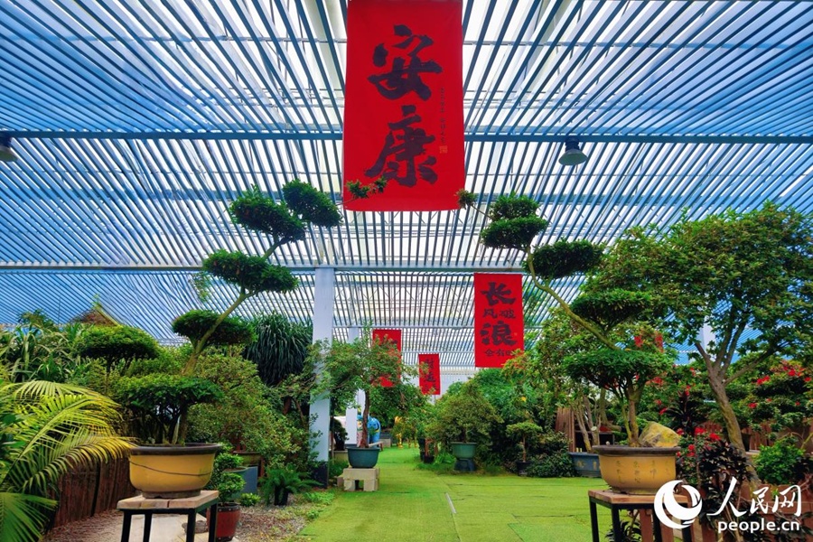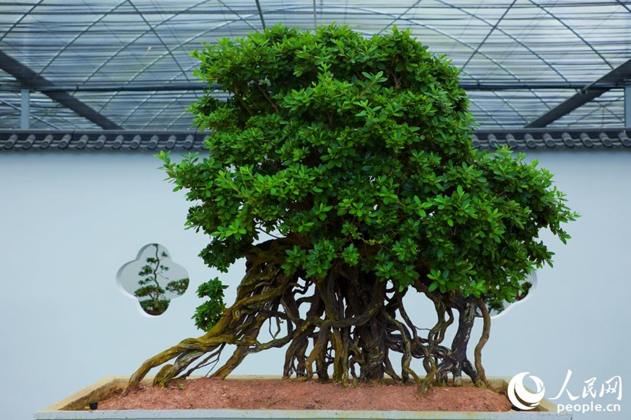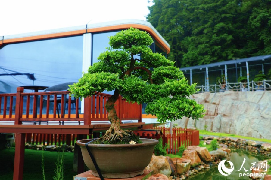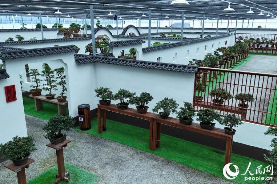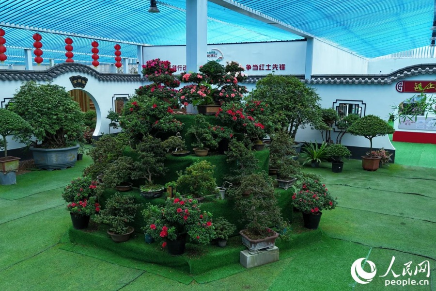 Plantas de azalea en modo bonsái se exhiben dentro del Parque Ecológico Santeng Azalea en la localidad de Yongfu, Zhangping, una ciudad a nivel de condado administrada por la ciudad de Longyan, en la provincia de Fujian. (Foto: Diario del Pueblo digital/ Li Weiyi)