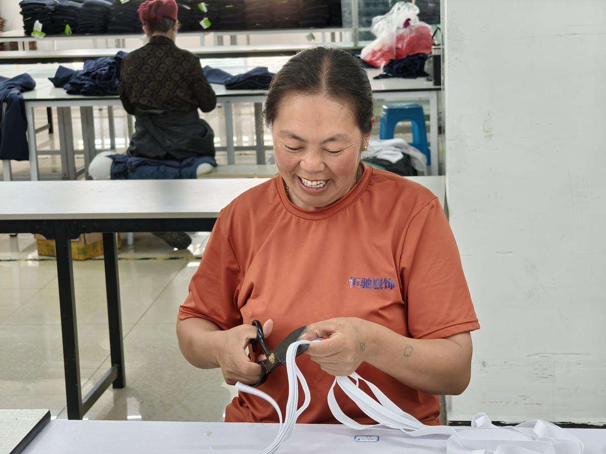 Jizu Shizuo, antigua residente de la aldea de Xuanya, trabaja en una fábrica textil a 10 minutos de su nuevo apartamento en el condado Zhaojue, prefectura autónoma Yi de Liangshan, provincia de Sichuan. [Foto de Peng Chao/chinadaily.com.cn]