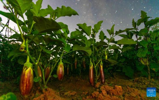 HARBIN, 3 agosto, 2025 (Xinhua) -- Imagen del 26 de julio de 2025 de berenjenas en un campo bajo el cielo estrellado, en el poblado de Lianjiangkou de la ciudad de Jiamusi, en la provincia de Heilongjiang, en el noreste de China. La provincia de Heilongjiang, un productor agrícola principal denominado "el granero de China", ha visto sus cosechas entrar en la etapa de maduración recientemente. (Xinhua/Zhu Zongqiang)