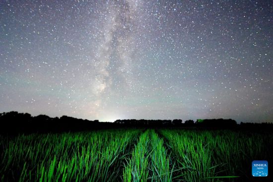 HARBIN, 3 agosto, 2025 (Xinhua) -- Imagen del 28 de julio de 2025 de un campo de arroz bajo el cielo estrellado, en la ciudad de Heihe, en la provincia de Heilongjiang, en el noreste de China. La provincia de Heilongjiang, un productor agrícola principal denominado "el granero de China", ha visto sus cosechas entrar en la etapa de maduración recientemente. (Xinhua/Qian Boyu)