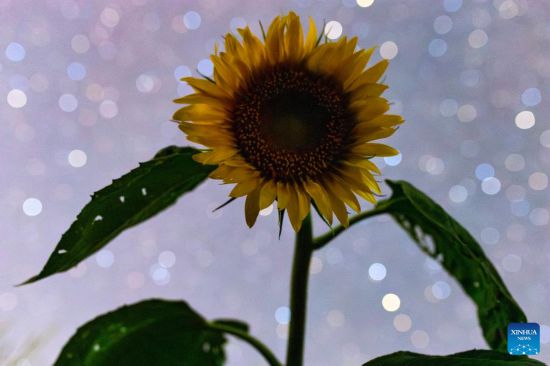 HARBIN, 3 agosto, 2025 (Xinhua) -- Imagen compuesta del 28 de julio de 2025 de un girasol bajo el cielo estrellado, en el poblado de Dayushu de la ciudad de Fujin, en la provincia de Heilongjiang, en el noreste de China. La provincia de Heilongjiang, un productor agrícola principal denominado "el granero de China", ha visto sus cosechas entrar en la etapa de maduración recientemente. (Xinhua/Qu Yubao)