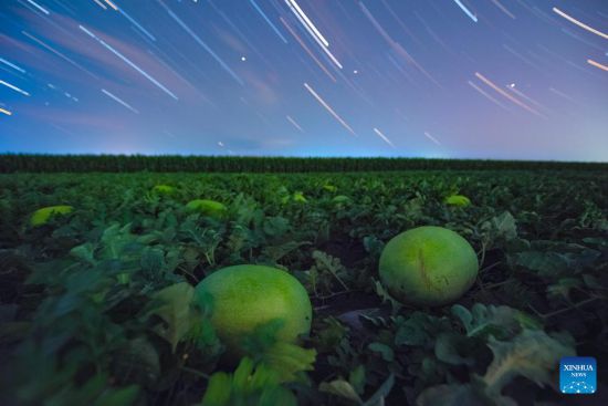 HARBIN, 3 agosto, 2025 (Xinhua) -- Imagen compuesta del 23 de julio de 2025 de un campo de sandías bajo el cielo estrellado, en el poblado de Shangjieji de la ciudad de Fujin, en la provincia de Heilongjiang, en el noreste de China. La provincia de Heilongjiang, un productor agrícola principal denominado "el granero de China", ha visto sus cosechas entrar en la etapa de maduración recientemente. (Xinhua/Qu Yubao)