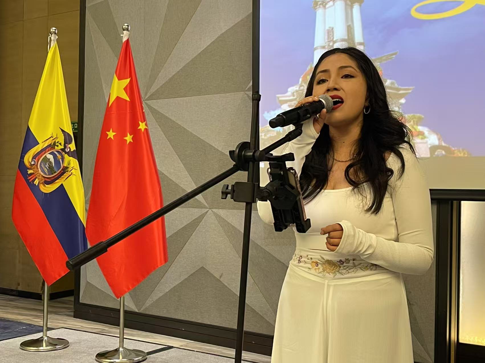 La estudiante Elizabeth Moreno cantó piezas ecuatorianas durante el acto por el 216 aniversario de la Independencia del Ecuador, Beijing, 6 de agosto del 2025. (Foto: YAC) |