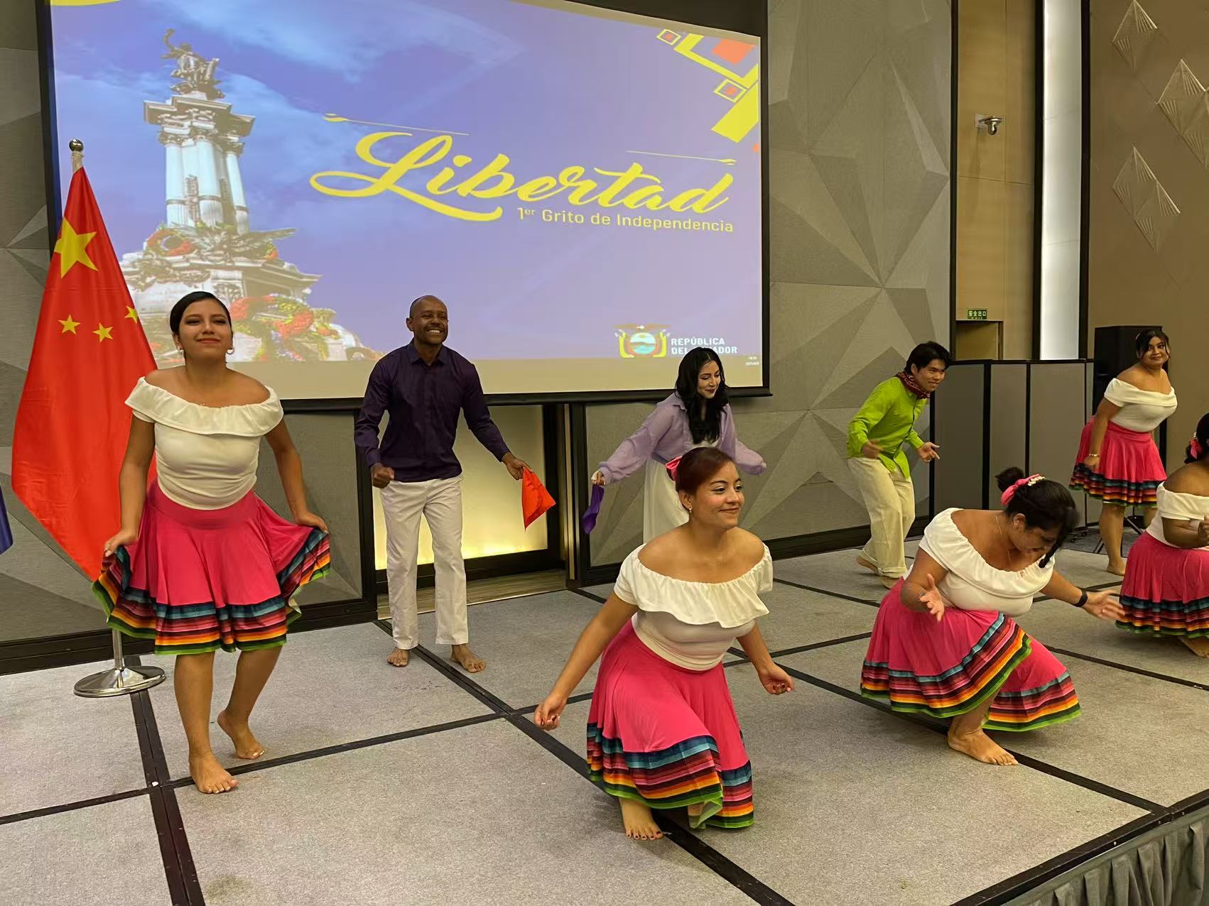 En el acto de confraternidad y civismo con la comunidad ecuatoria por el 216 aniversario de la Independencia del Ecuador, actuaron como solistas el artista Carlos Ledesma, cantante ecuatoriano originario de Guayaquil y radicado en la capital china, donde ha ganado reconocimiento por su talento musical y su contribución a los intercambios culturales. También se escucharon canciones como “La Bocina” o “La canción de los Andes”, interpretadas por Elizabeth Moreno, estudiante ecuatoriana que cursa una maestría en relaciones exteriores. Como colofón, el grupo Danza Ecuador derrochó alegrías y talento sobre el escenario.