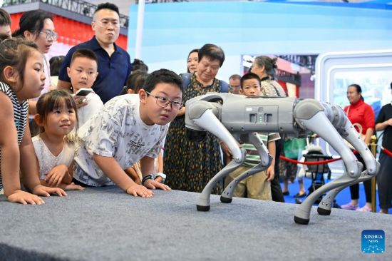 TAIYUAN, 21 agosto, 2025 (Xinhua) -- Ni?os interactúan con un perro robot en la 7a Feria de Industrias Culturales de Shanxi, en Taiyuan, en la provincia de Shanxi, en el norte de China, el 21 de agosto de 2025. La feria comenzó aquí el jueves y durará hasta el 25 de agosto, atrayendo a aproximadamente 2.000 expositores de más de 30 países y regiones de todo el mundo. (Xinhua/Yang Chenguang)
