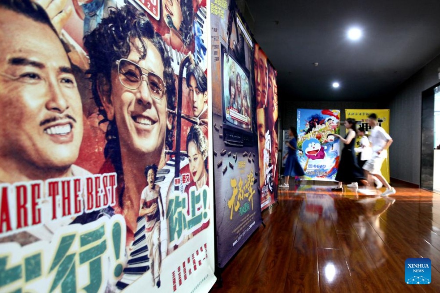 Imagen del 18 de agosto de 2025 de espectadores caminando frente a carteles de películas en un cine, en Linyi, en la provincia de Shandong, en el este de China. Los ingresos de taquilla de China en el verano han superado los 11.000 millones de yuanes (unos 1.500 millones de dólares estadounidenses) hasta el domingo, con los títulos nacionales dominando los primeros puestos de la temporada. (Xinhua/Wu Jiquan)