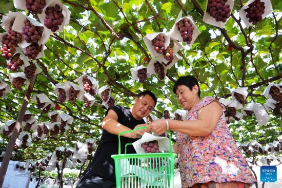 BEIJING, 11 septiembre, 2025 (Xinhua) -- Aldeanos cosechan uvas, en el distrito de Chengyang de la ciudad de Qingdao, en la provincia de Shandong, en el este de China, el 11 de septiembre de 2025. (Xinhua/Wang Haibin)