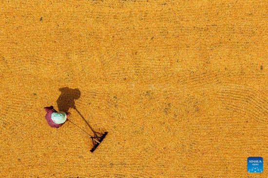 BEIJING, 11 septiembre, 2025 (Xinhua) -- Vista aérea tomada con un dron el 9 de septiembre de 2025 de un aldeano aireando maíces, en el poblado de Baotai, en el distrito de Pingyi, en la ciudad de Linyi, en la provincia de Shandong, en el este de China. (Xinhua/Wu Jiquan)