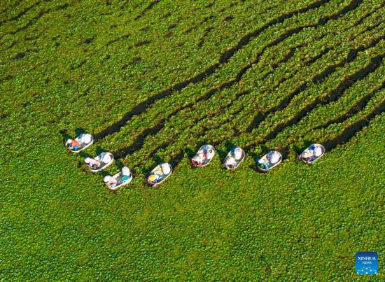 BEIJING, 11 septiembre, 2025 (Xinhua) -- Vista aérea tomada con un dron el 10 de septiembre de 2025 de aldeanos recogiendo casta?as de agua, en el poblado de Suchen del distrito de Hailing, en la ciudad de Taizhou, en la provincia de Jiangsu, en el este de China. (Xinhua/Zhou Shegen)