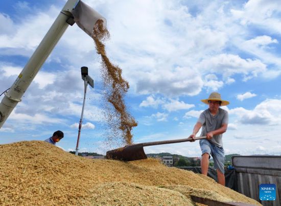 BEIJING, 11 septiembre, 2025 (Xinhua) -- Imagen tomada con un dron de agricultores cosechando arroz, en el municipio de Shitan del distrito de Hengdong, en la ciudad de Hengyang, en la provincia de Hunan, en el centro de China, el 11 de septiembre de 2025. (Xinhua/Cao Zhengping)