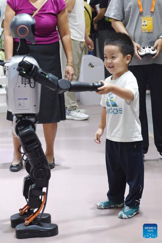 BEIJING, 13 septiembre, 2025 (Xinhua) -- Un ni?o interactúa con un robot humanoide en la Feria Internacional de Comercio de Servicios de China (CIFTIS, por sus siglas en inglés) 2025, en el parque Shougang, en Beijing, capital de China, el 13 de septiembre de 2025. La CIFTIS 2025 está abierta al público en general del 13 al 14 de septiembre. Los visitantes con reservación pueden acceder a la feria de forma gratuita. (Xinhua/Liu Lingyi)