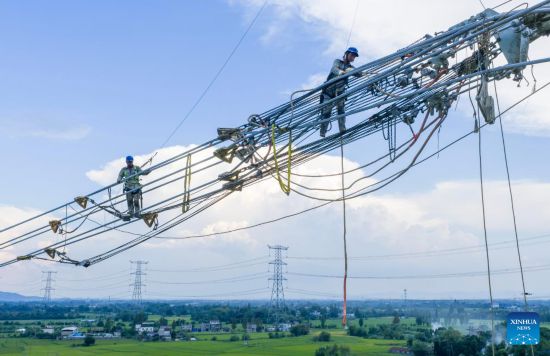 Trabajadores realizan tareas de cableado para el proyecto de transmisión de corriente continua de ultra alta tensión de ±800 kV entre Gansu y Zhejiang