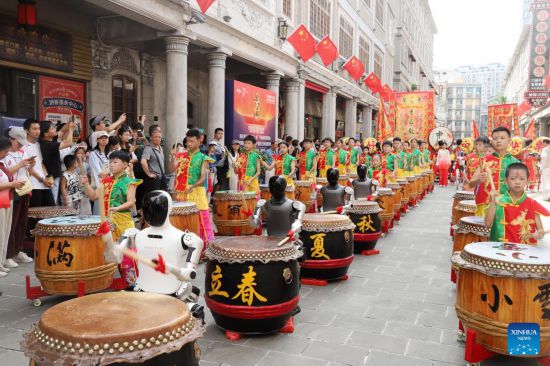 BEIJING, 6 octubre, 2025 (Xinhua) -- Artistas y robots tocan la batería en un punto escénico, en Shantou, en la provincia de Guangdong, en el sur de China, el 6 de octubre de 2025. Personas participaron en diversos eventos culturales folclóricos tradicionales el lunes para celebrar el Festival del Medio Oto?o. (Xinhua/Yao Jun)