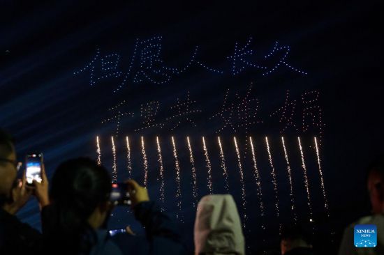 BEIJING, 6 octubre, 2025 (Xinhua) -- Personas toman fotografías de un espectáculo de luces con drones, en Harbin, en la provincia de Heilongjiang, en el noreste de China, el 6 de octubre de 2025. Personas participaron en diversos eventos culturales folclóricos tradicionales el lunes para celebrar el Festival del Medio Oto?o. (Xinhua/Zhang Tao)