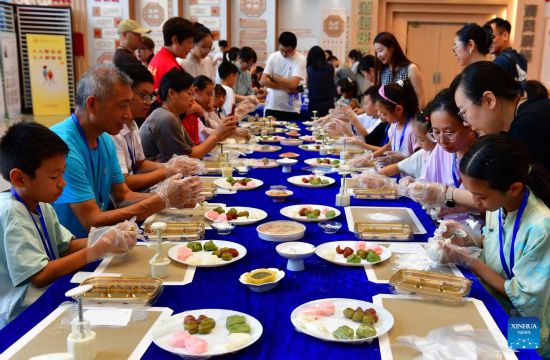 BEIJING, 6 octubre, 2025 (Xinhua) -- Ni?os y sus padres elaboran pasteles de luna, en Jiangyin, en la provincia de Jiangsu, en el este de China, el 6 de octubre de 2025. Personas participaron en diversos eventos culturales folclóricos tradicionales el lunes para celebrar el Festival del Medio Oto?o. (Xinhua/Huan Yueliang)