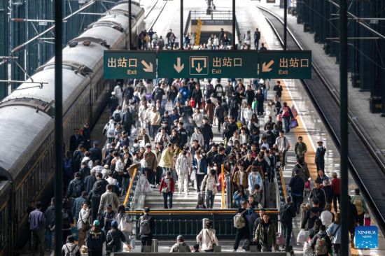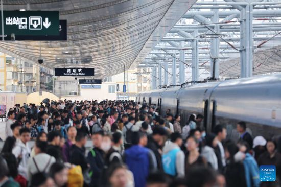 BEIJING, 7 octubre, 2025 (Xinhua) -- Personas abordan un tren en la Estación del Ferrocarril de Kunming, en Kunming, en la provincia de Yunnan, en el suroeste de China, el 7 de octubre de 2025. A medida que las vacaciones del Día Nacional y el Festival de Medio Oto?o llegan a su fin, los flujos de viajes de regreso aumentan en todo el país. (Xinhua/Yang Zixuan)