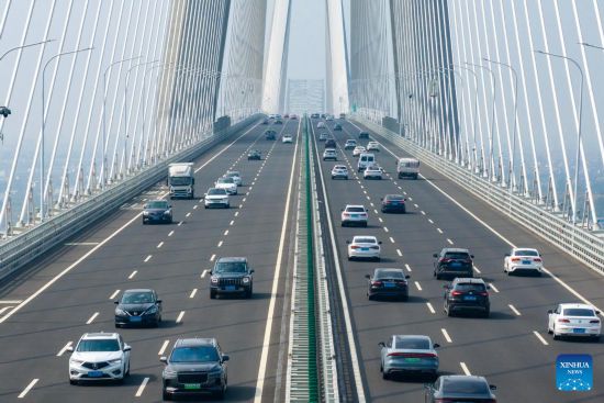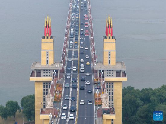 BEIJING, 7 octubre, 2025 (Xinhua) -- Imagen tomada con un dron el 7 de octubre de 2025 del flujo vehicular en el puente de Nanjing sobre el río Yangtse, en Nanjing, en la provincia de Jiangsu, en el este de China. A medida que las vacaciones del Día Nacional y el Festival de Medio Oto?o llegan a su fin, los flujos de viajes de regreso aumentan en todo el país. (Xinhua/Yang Suping)