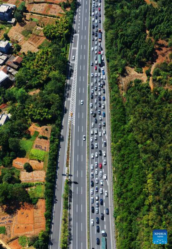 BEIJING, 7 octubre, 2025 (Xinhua) -- Imagen tomada con un dron el 7 de octubre de 2025 del flujo vehicular de una autopista, en Chenzhou, en la provincia de Hunan, en el centro de China. A medida que las vacaciones del Día Nacional y el Festival de Medio Oto?o llegan a su fin, los flujos de viajes de regreso aumentan en todo el país. (Xinhua/Huang Chuntao)