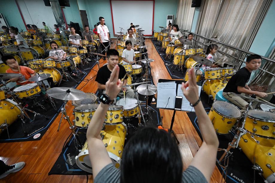El Proyecto Galaxia Luciérnaga, una banda inclusiva para personas con discapacidad compuesta por cuatro ni?os del Centro de Educación Especial Yunyang, en el distrito Yunyang de Chongqing, suroeste de China, ensaya bajo la guía de sus maestros el 3 de septiembre. [Foto de Li Ye/Para chinadaily.com.cn]