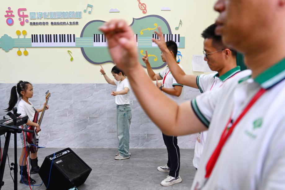 El Proyecto Galaxia Luciérnaga, una banda inclusiva de cuatro ni?os con discapacidad del Centro de Educación Especial Yunyang en el distrito Yunyang de Chongqing, suroeste de China, ensaya bajo la guía de sus maestros el 3 de septiembre. [Foto de Li Ye/Para chinadaily.com.cn]