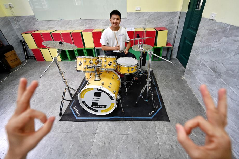 El Proyecto Galaxia Luciérnaga, una banda inclusiva de cuatro ni?os con discapacidad del Centro de Educación Especial Yunyang en el distrito Yunyang de Chongqing, suroeste de China, ensaya bajo la guía de sus maestros el 3 de septiembre. [Foto de Li Ye/Para chinadaily.com.cn]