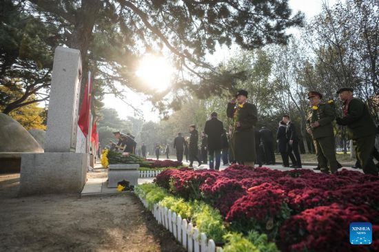 SHENYANG, 25 octubre, 2025 (Xinhua) -- Una ceremonia de presentación de cestas de flores se lleva a cabo en el cementerio de los mártires de los Voluntarios del Pueblo Chino (VPCh), en Shenyang, en la provincia de Liaoning, en el noreste de China, el 25 de octubre de 2025. La provincia de Liaoning realizó el sábado ceremonias de presentación de cestas de flores en Shenyang y Dandong para conmemorar el 75o aniversario del ingreso a la República Popular Democrática de Corea de los VPCh para luchar en la Guerra de Resistencia contra la Agresión de Estados Unidos y de Ayuda a Corea. (Xinhua/Pan Yulong)