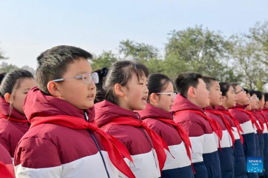SHENYANG, 25 octubre, 2025 (Xinhua) -- Estudiantes entonan el himno nacional durante una ceremonia de presentación de cestas de flores en la torre conmemorativa en el Salón Conmemorativo de la Guerra de Resistencia contra la Agresión de Estados Unidos y de Ayuda a Corea, en Dandong, en la provincia de Liaoning, en el noreste de China, el 25 de octubre de 2025. La provincia de Liaoning realizó el sábado ceremonias de presentación de cestas de flores en Shenyang y Dandong para conmemorar el 75o aniversario del ingreso a la República Popular Democrática de Corea de los Voluntarios del Pueblo Chino (VPCh) para luchar en la Guerra de Resistencia contra la Agresión de Estados Unidos y de Ayuda a Corea. (Xinhua/Wu Qinghao)