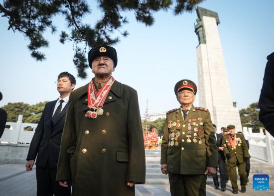SHENYANG, 25 octubre, 2025 (Xinhua) -- Veteranos de los Voluntarios del Pueblo Chino (VPCh) presentan flores a los mártires de los VPCh en el cementerio de los mártires de los VPCh, en Shenyang, en la provincia de Liaoning, en el noreste de China, el 25 de octubre de 2025. La provincia de Liaoning realizó el sábado ceremonias de presentación de cestas de flores en Shenyang y Dandong para conmemorar el 75o aniversario del ingreso a la República Popular Democrática de Corea de los VPCh para luchar en la Guerra de Resistencia contra la Agresión de Estados Unidos y de Ayuda a Corea. (Xinhua/Pan Yulong)
