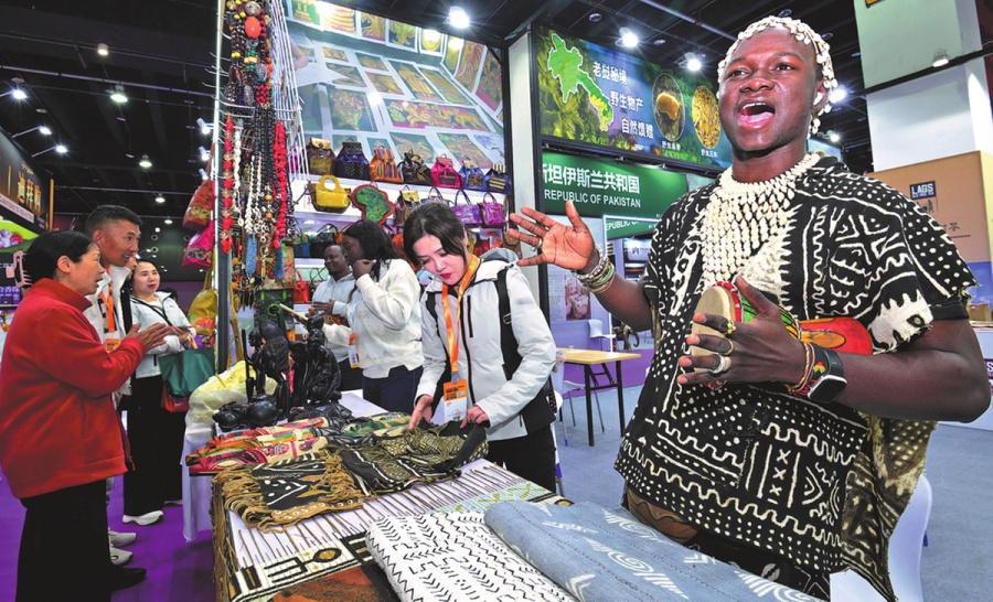 Expositor de Ghana, vestido con atuendo tradicional, toca un tambor este jueves mientras promociona artículos de artesanía local en la Exposición de Productos de Importación dentro de la Feria Internacional de Commodities de China en Yiwu, provincia de Zhejiang. (Foto: Lyu Bin/ China Daily)