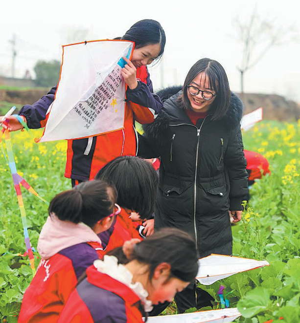 Li (a la derecha) instruye a sus estudiantes durante una lección de poesía en un campo de flores. (Foto: China Daily)